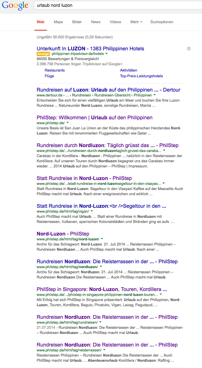 Bei einem meiner letzten Projekte hat sich der Wahrheitsgehalt meiner Aussage schon deutlich untermauert. PhilStep – ein kleines inhabergeführtes Reiseunternehmen auf den Philippinen mit Schwerpunkt von ungewöhnlichen, kreativen Rundreisen durch die traumhaften Landschaften von Nord Luzon hat sich mit der konsequenten Einhaltung meiner Ratschläge ein aussagekräftiges Google-Ranking erarbeitet.